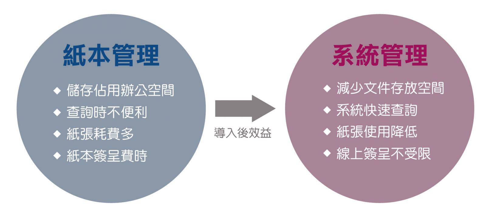2018年眾智開始將紙本走向E化,導入了WebISO文件管理系統,首先解決了紙本存放的空間問題,再者邁向無紙化也節省了紙張的使用,為地球盡一份環保心力,另一個導入效益:主管在國外出差有時長達一個月,簽核的時程因此拉長,但透過WebISO內建的簽核流程,只要有網路的地方皆能登入系統進行簽核,不再受時間距離限制,提升了許多辦公作業效率!